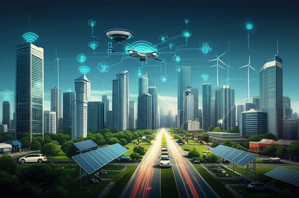 5. Smart Grid & Energi Terbarukan: Jaringan listrik cerdas yang mengintegrasikan sumber energi terbarukan (surya, angin) dan mengelola distribusi energi secara efisien, mengurangi pemborosan dan jejak karbon kota.